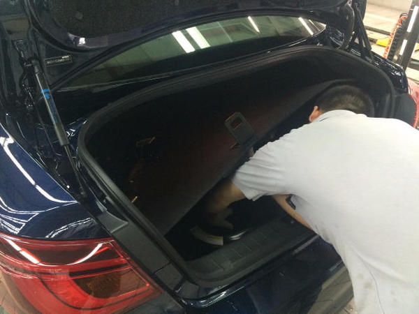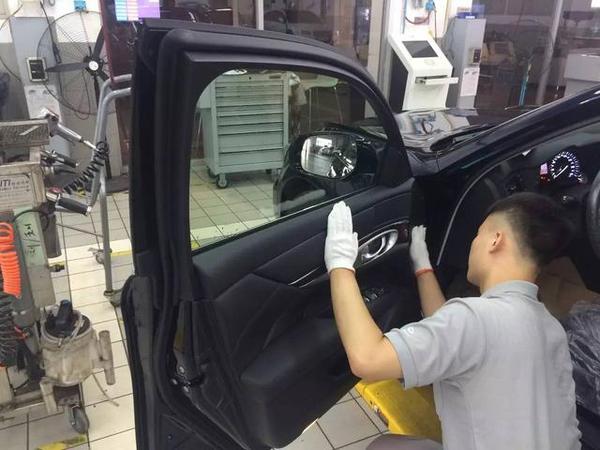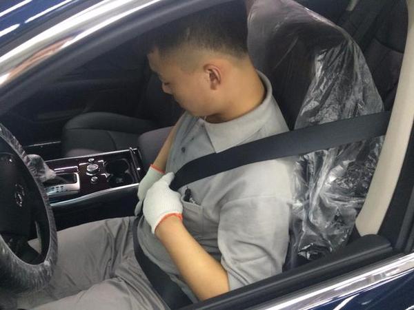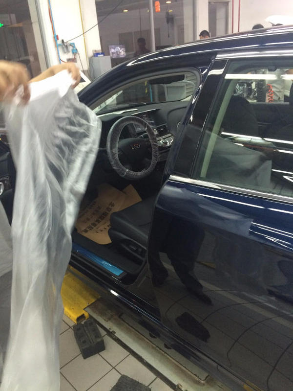 接下來(lái),車(chē)停入工位,正式開(kāi)端。先套上防塵塑料布。
