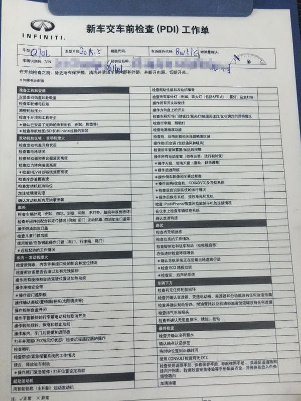 好了,這就開(kāi)端吧。首要店里的師傅會(huì )拿著(zhù)一張PDI工作單,里邊大大小小總共有70多個(gè)查看項目。不一樣品牌的PDI標準會(huì )略有不一樣,但至少應當依照他PDI查看單上的流程做完。不做能夠不簽字。